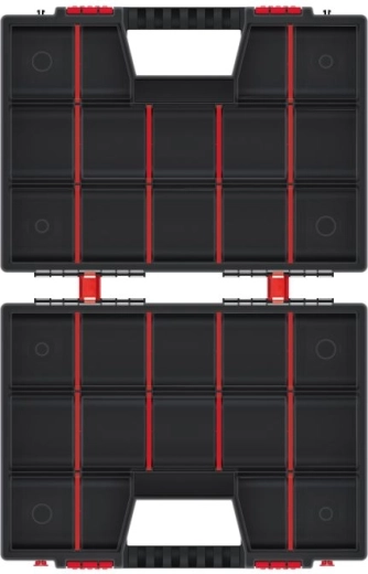 De binnenruimte pas je eenvoudig aan met de uitneembare tussenschotten – creëer precies de vakken die je nodig hebt. Robuust kunststof, dubbele sluitingen en naar elkaar toegekeerde deksels houden alles veilig op zijn plek, ook tijdens het dragen.