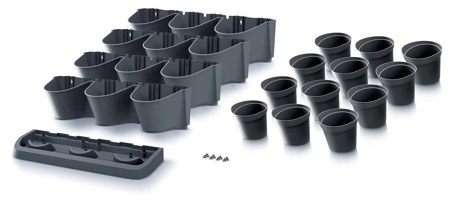 Creëer overal je eigen groene wand met deze verticale set bloempotten in antraciet. De modulaire oplossing bespaart ruimte, biedt eenvoudig onderhoud en een stabiele basis voor een gezonde groei van kruiden en sierplanten – zowel binnen als buiten.