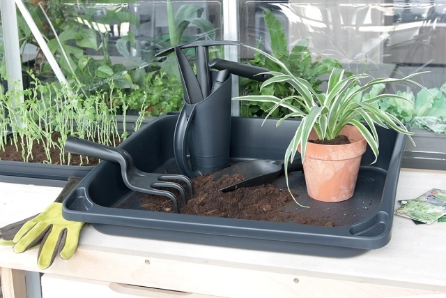 De universele RESPANA-set van licht maar duurzaam kunststof dekt de meeste veelvoorkomende tuinklussen – van aanplant en verplanten tot het onderhoud van borders. Twee schepjes (29 cm) en een praktische schep-scoop zorgen voor nauwkeurige dosering van substraat, de cultivator (26 cm) verlucht de grond snel en de hak met klauw (29 cm) helpt bij wieden en het losmaken van het oppervlak. De plantstok (20,5 cm) vergemakkelijkt het planten van bollen en zaailingen, terwijl de multifunctionele gieter met broeskop zorgt voor een zachte bewatering.