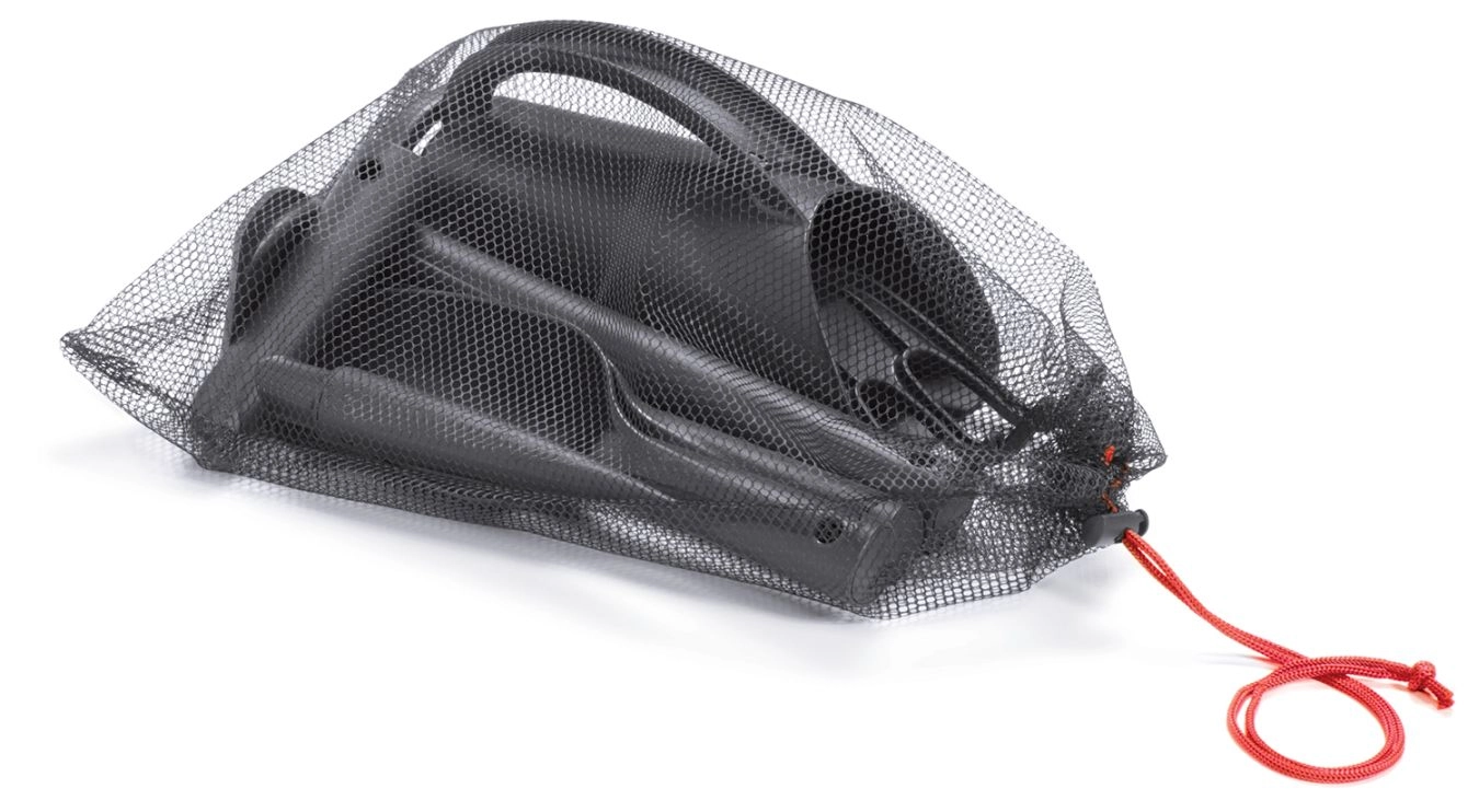 De set is opgeborgen in een lichte netachtige trekkoordtas die de tools bij elkaar houdt, zand en water laat weglopen en het dragen en opbergen vergemakkelijkt.