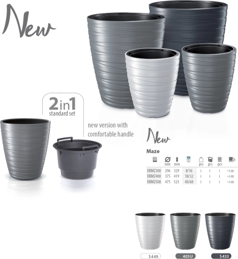 De bloempot met inzet MAZE in de kleur grijze steen past perfect in zowel moderne als klassieke interieurs en exterieurs. Duurzaam plastic zorgt voor een lange levensduur, minimaal onderhoud en de mogelijkheid tot gebruik het hele jaar door, zowel buiten als binnen. Dankzij de binneninzet wordt overtollig water effectief afgevoerd, wat optimale omstandigheden voor de wortels creëert en het risico op overbewatering vermindert.