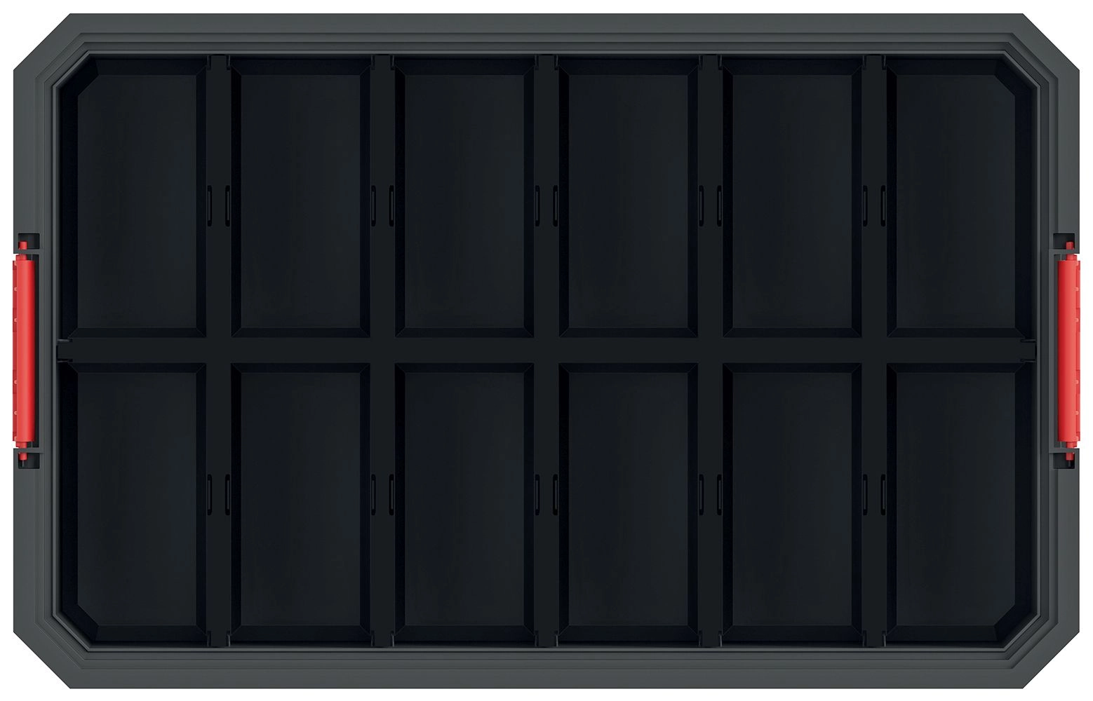 Richt de binnenkant van de box precies in naar de aard van het opgeslagen materiaal. Het raster en de tussenschotten houden schroeven, bits en kleine onderdelen overzichtelijk van elkaar gescheiden.