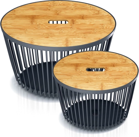 Praktische set van twee ovale CLUBO-manden met een inhoud van 30 en 55 liter in de elegante kleur antraciet met natuurlijke bamboe deksels. Ideaal voor het sorteren van was, het opbergen van speelgoed of het organiseren van het huishouden. Combineert modern design met functionaliteit, eenvoudig onderhoud en een tijdloze uitstraling. Universeel gebruik, stijlvolle combinatie van bamboe en kunststof en twee volumes voor maximale flexibiliteit.