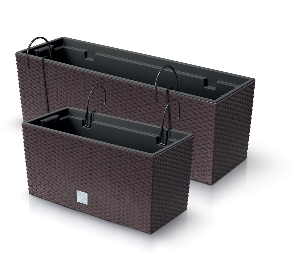 Elegante hangende balkonbak met ratanlook voor binnen en buiten. Gemaakt van duurzaam kunststof met UV-bescherming, voorzien van ophanghaken voor de balustrade en een interne stevige inzet voor eenvoudige plantenverzorging. Licht, kleurecht en onderhoudsarm.