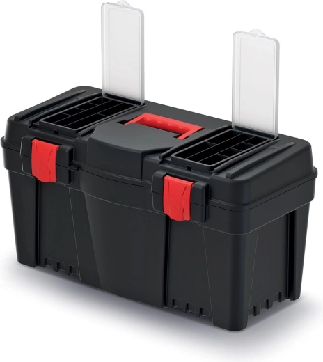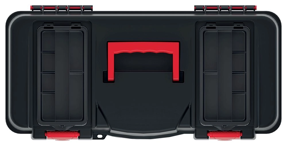 De slimme interne indeling omvat een uitneembare draaglade voor vaak gebruikt gereedschap en een ruime hoofdvak voor groter materiaal. Twee bovenste organizers met transparante deksels bieden snelle toegang tot klein bevestigingsmateriaal, schroeven of bits zonder de hele koffer te hoeven openen.