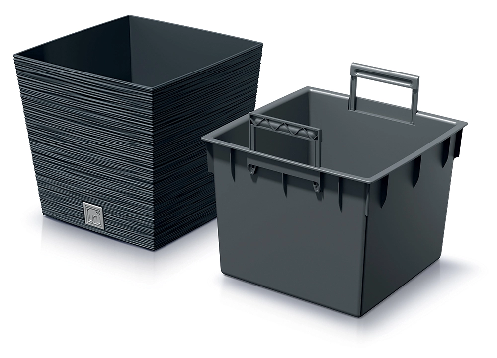 Het systeem met buitenpot en binneninzet met neerklapbare handgrepen maakt snel uitnemen van planten en gemakkelijk onderhoud mogelijk.