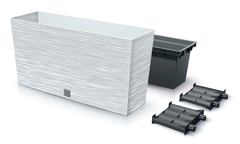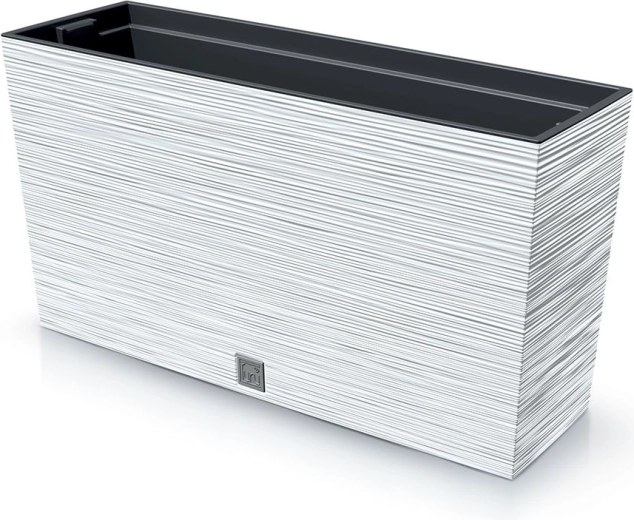 Stijlvolle bloembak Furu M met een lengte van 77 cm in elegant wit, ideaal voor balkon, terras en interieur. Het geribbelde oppervlak geeft een moderne uitstraling en verhoogt de stabiliteit. Duurzaam kunststof met UV-bescherming zorgt voor een lange levensduur, terwijl de praktische binneninleg het planten en onderhoud vergemakkelijkt.