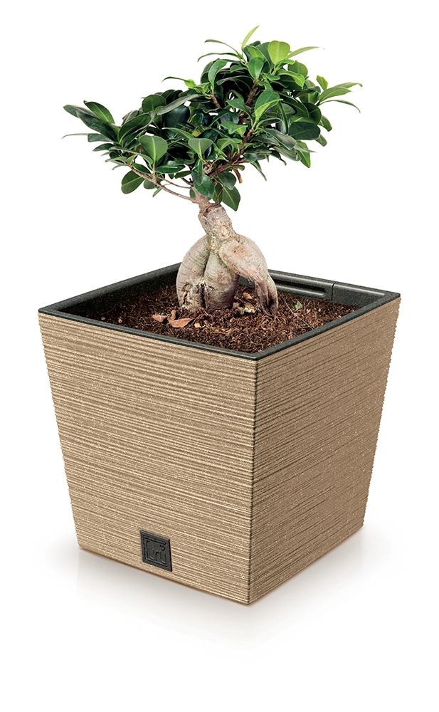 De bloempot Furu Square Low Eco Wood in de kleur naturo combineert modern design met praktische functies. De vierkante vorm met subtiele ribbeling geeft je planten een elegant kader en dankzij de geïntegreerde inzet is de handling van planten en water geven uiterst comfortabel. De lichte maar stevige constructie van ECO‑kunststof is geschikt voor in huis, op het balkon en op het terras.