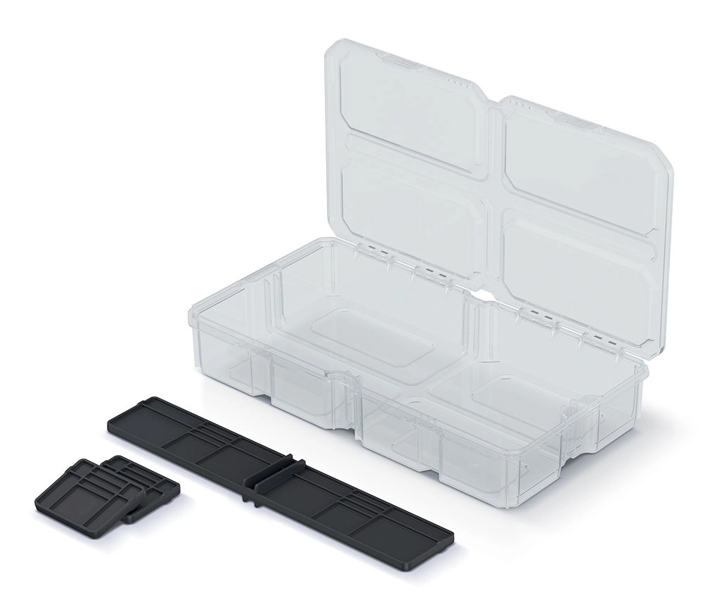 Houd orde in werkplaats, garage en thuis met de compacte MSX BOX organizer. Het transparante deksel biedt direct overzicht zonder onnodig openen, wat tijd bespaart en het werk efficiënter maakt. Dankzij de drie uitneembare tussenschotten stel je de binnenruimte eenvoudig precies af op de actuele behoeften.