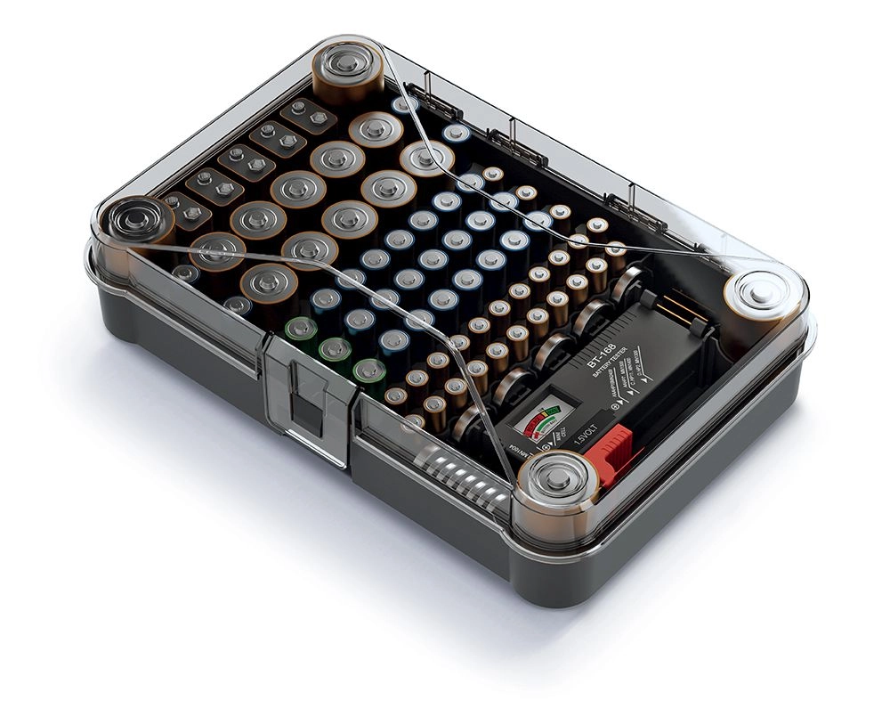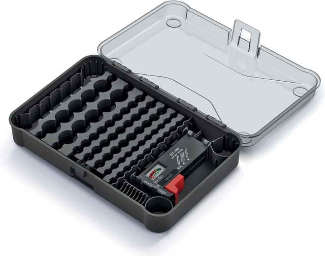 De praktische batterijkoffer met transparant deksel biedt een helder overzicht van AA-, AAA-, C-, D- en 9V-cellen, die je in de toegewezen compartimenten opbergt. De geïntegreerde analoge tester laat je in een oogwenk de resterende capaciteit controleren, zodat je altijd weet welke batterijen klaar zijn voor gebruik.