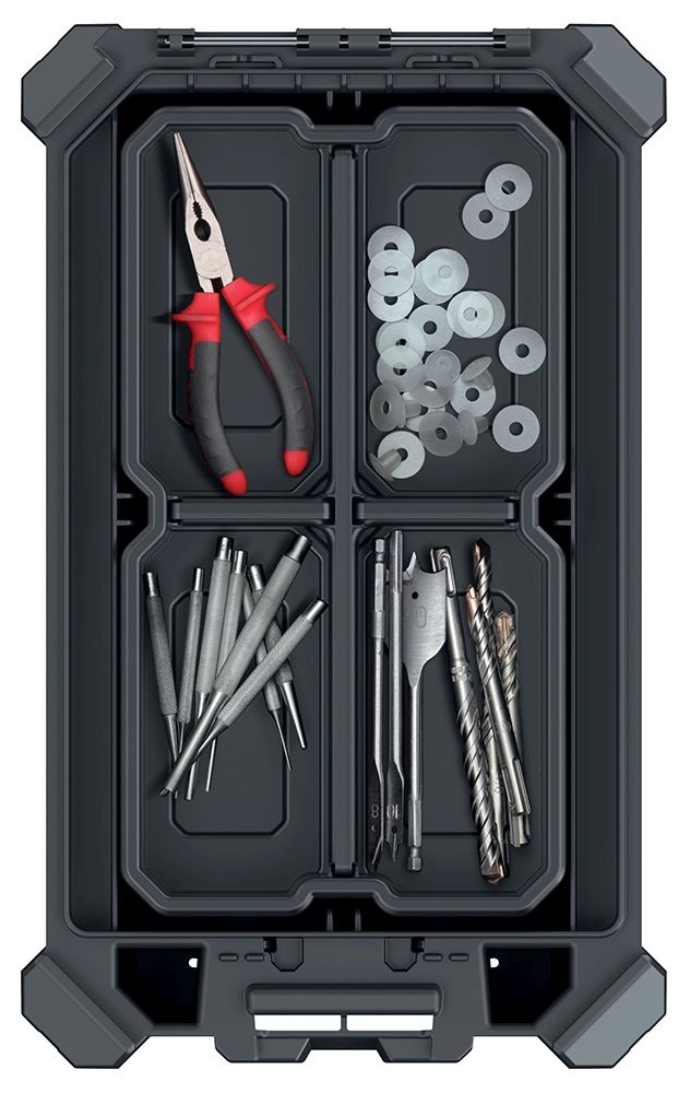 Dankzij de uitneembare tussenschotten past u de binnenruimte eenvoudig aan uw behoeften aan. De modulaire constructie is ideaal voor zowel professionals als doe-het-zelvers – de organizer kan worden gekoppeld aan andere elementen uit de MSX-serie om zo een compleet, draagbaar en uitbreidbaar opslagsysteem te creëren.