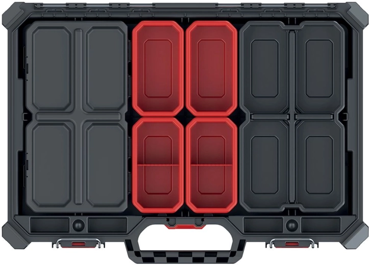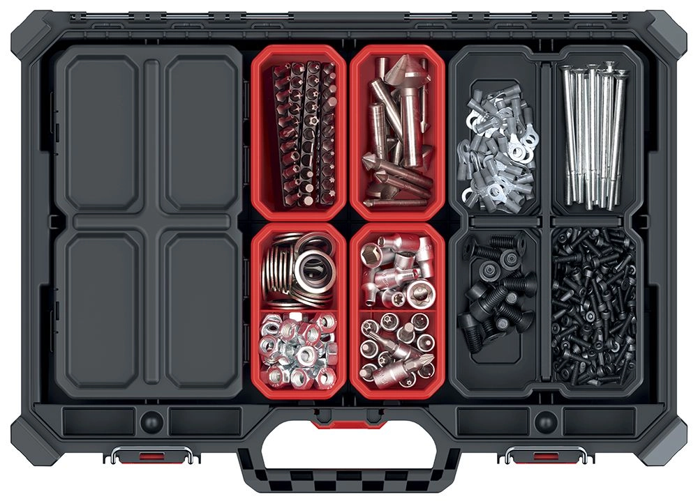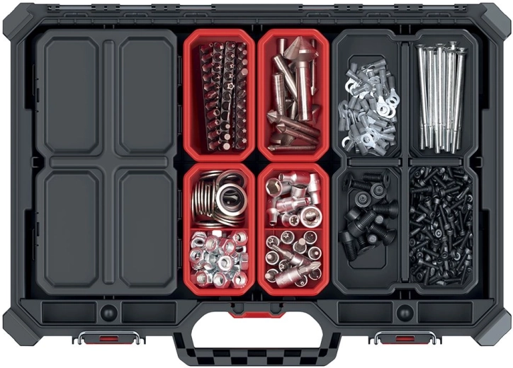 Dankzij 7 uitneembare bakjes en 3 scheidingswanden pas je de binnenruimte eenvoudig aan je actuele behoeften aan. Metalen scharnieren en ABS-clips met metaal houden het deksel stevig gesloten, terwijl de stof- en waterdichte afdichting de inhoud beschermt tijdens transport en bij werkzaamheden in stoffige of vochtige omgevingen. De organizer kan in het X BLOCK-systeem worden gekoppeld dankzij het vergrendelingsmechanisme voor gemakkelijk stapelen en dragen.