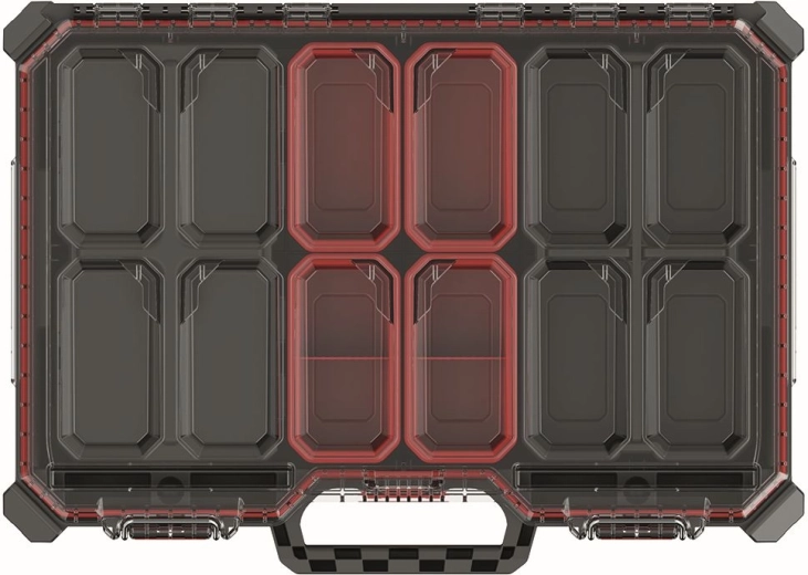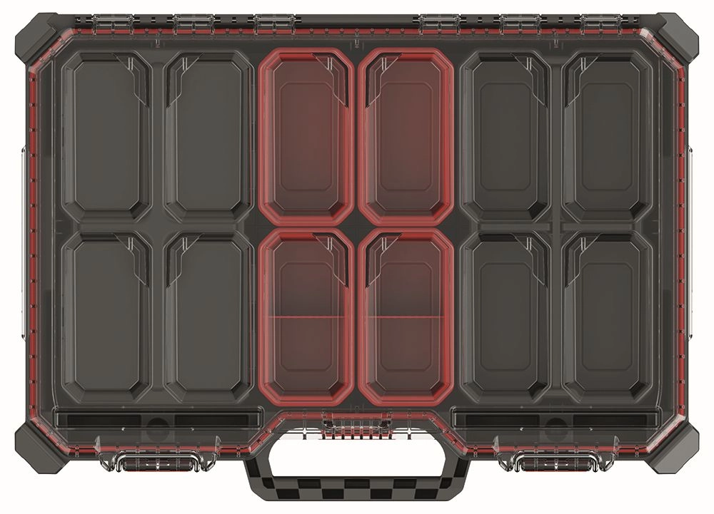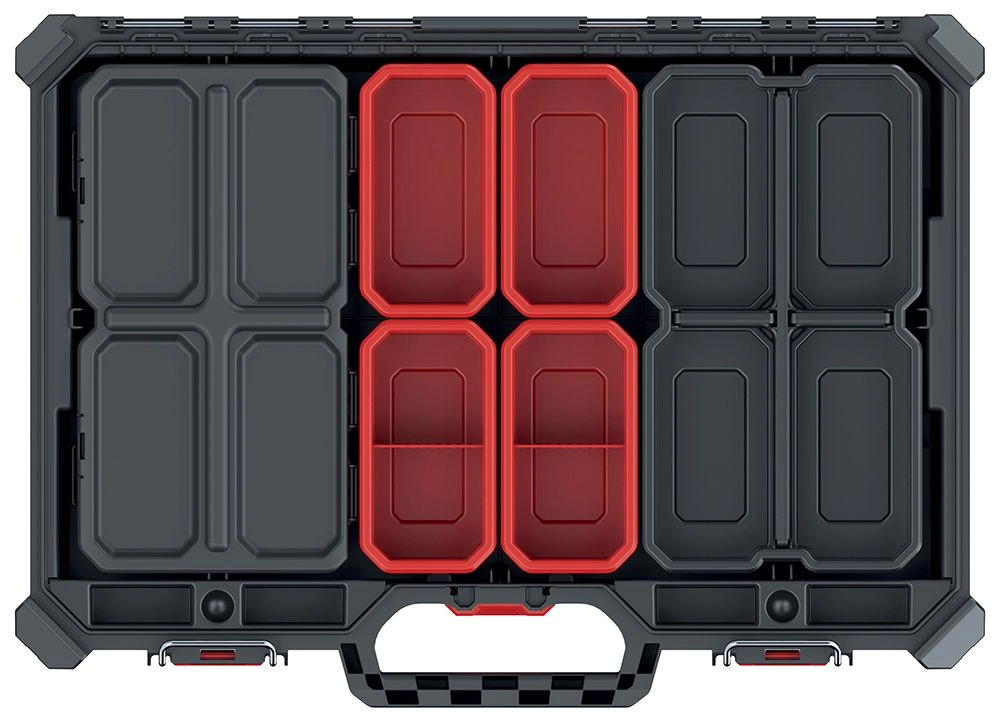Houd orde in de werkplaats, garage en tijdens montagewerkzaamheden op locatie. Deze lage organizer met compacte afmetingen van 54,3 × 39 × 7,7 cm biedt een doordachte indeling voor schroeven, bouten, pluggen en klein gereedschap. Het transparante polycarbonaat deksel maakt snelle inzage mogelijk zonder te openen en de robuste kunststof behuizing weerstaat stoten en dagelijks gebruik.