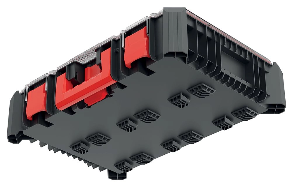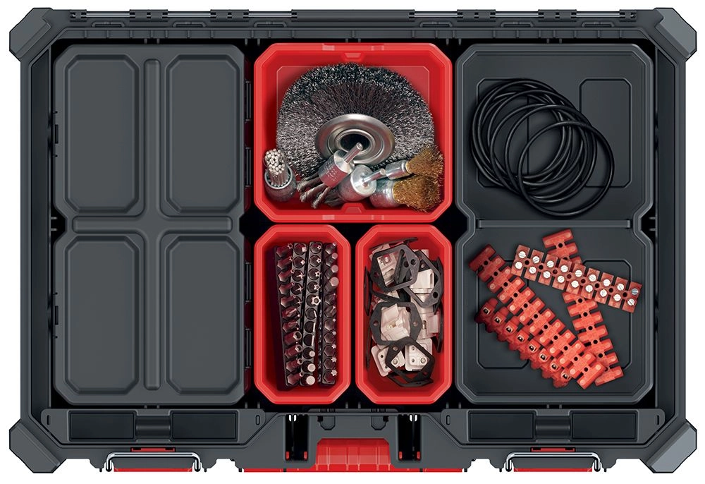 Met uitneembare bakjes en verdelers richt je alles eenvoudig in naar de grootte van de onderdelen. De organizer kan gekoppeld worden aan het X BLOCK-systeem via de X BLOCK BRIDGE.
