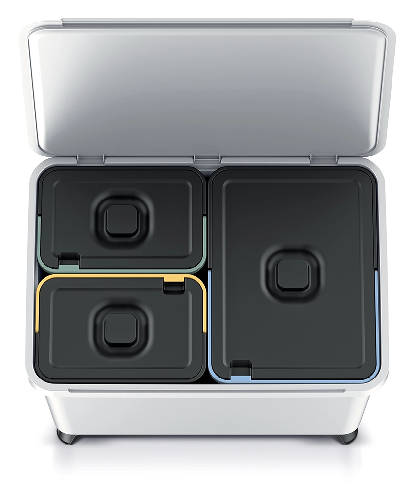 Set van 1×23 l en 2×10 l met duidelijke kleuren voor kunststof, papier en glas versnelt correct sorteren en houdt elke dag orde.