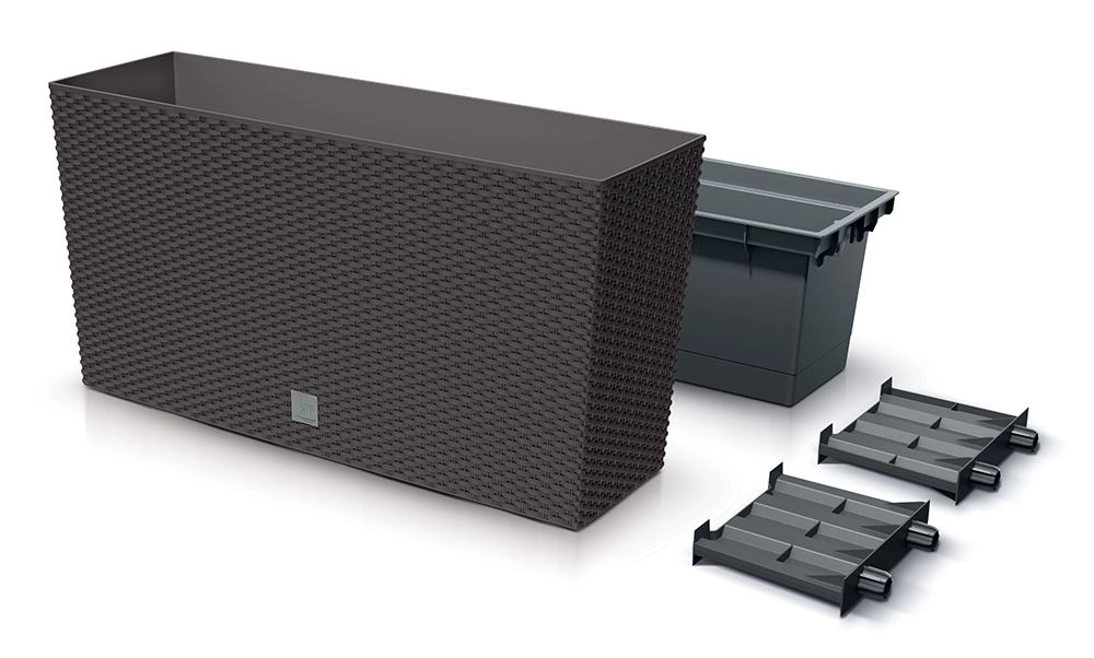 Elegante balkonbak met een rotanlook en geïntegreerde inzet voor eenvoudig beplanten. Duurzame kunststof in de tint umbra, geschikt voor binnen en buiten, met voldoende ruimte voor wortels, lange levensduur en moeiteloos onderhoud.