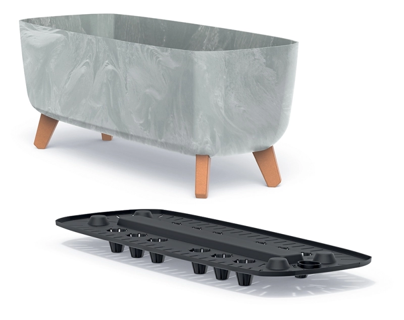 Dankzij de verhoogde constructie is er betere luchtcirculatie en blijft het oppervlak onder de bloembak schoon. Het materiaal weerstaat UV-straling en mechanische slijtage, zodat de kleur behouden blijft en de vorm niet vervormt, ook bij gebruik buiten.