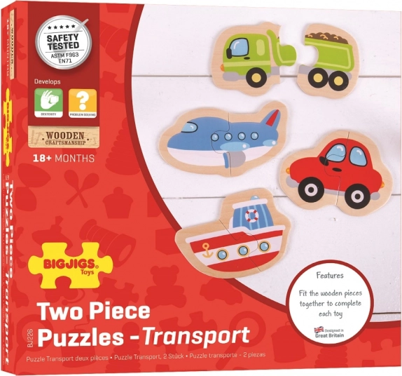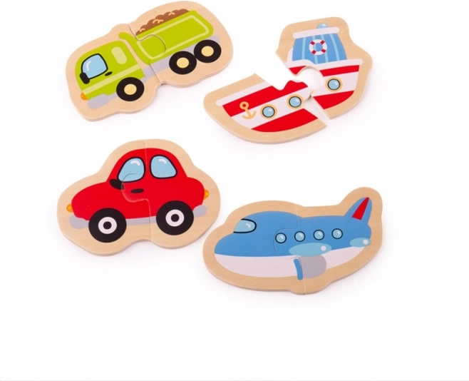 Deze set houten puzzels bevat vier favoriete vervoermiddelen die kinderen eenvoudig uit twee stevige stukjes kunnen samenstellen. Eenvoudige vormen, heldere kleuren en een prettige houten afwerking nodigen uit tot herhaald spelen en ondersteunen op natuurlijke wijze de ontwikkeling van de taal, het herkennen van vormen en kleuren en de concentratie.