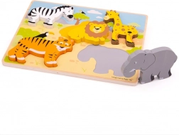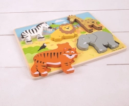 Gemaakt van hoogwaardig, verantwoord verkregen hout en ontworpen om te voldoen aan de huidige Europese veiligheidsnormen. De puzzel bevat 5 grote stukken met safarimotieven die kinderen plezier geven in ontdekken en leren.