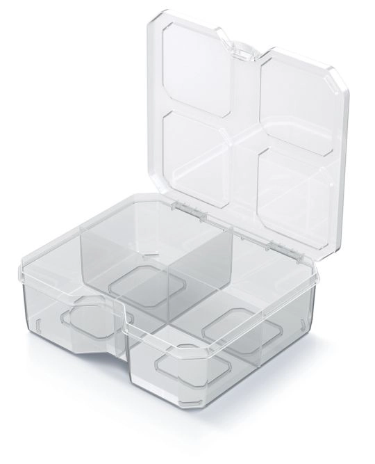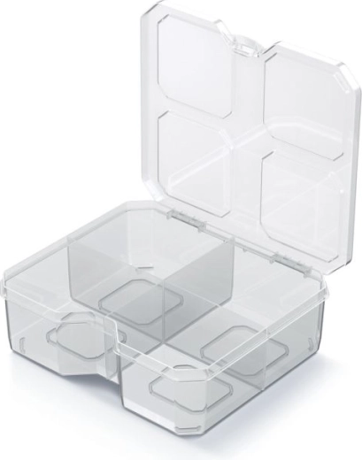 Praktische SQR box-organizer met afmetingen 15,6 × 14 × 5 cm voor overzichtelijke opslag van kleine items in huis, op kantoor en in de werkplaats. Dankzij de transparante uitvoering vind je snel wat je nodig hebt zonder te openen. Vier stevige vakken en duurzame schotjes houden schroeven, paperclips en andere kleinigheden veilig op hun plaats, terwijl het lichte kunststof lichaam het hanteren en meenemen vergemakkelijkt.