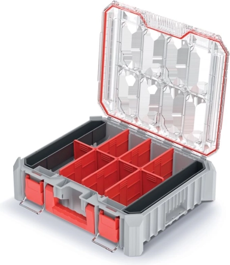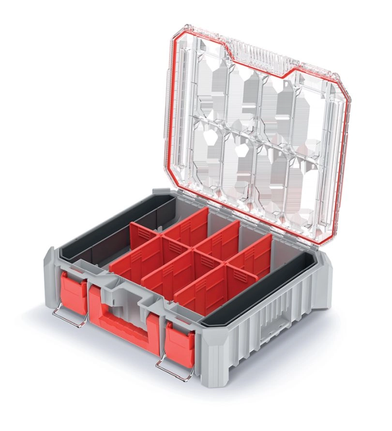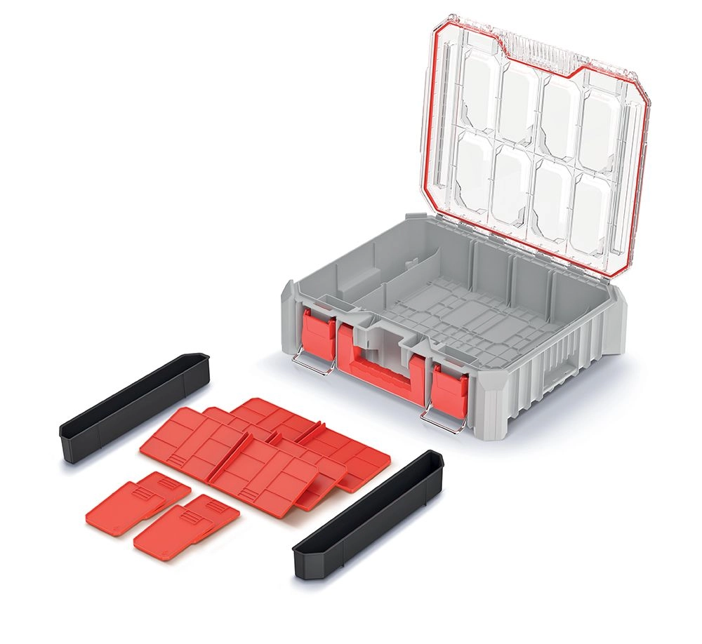 Twee uitneembare bakjes en zeven verwijderbare tussenschotten bieden een flexibele, modulaire indeling. De stevige afdichting beschermt de inhoud tegen stof en vocht, waardoor de organizer ideaal is voor zowel de werkplaats als montage op locatie. Metalen/stevige vergrendelingen en een robuust handvat zorgen voor veilig transport.