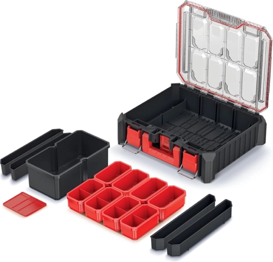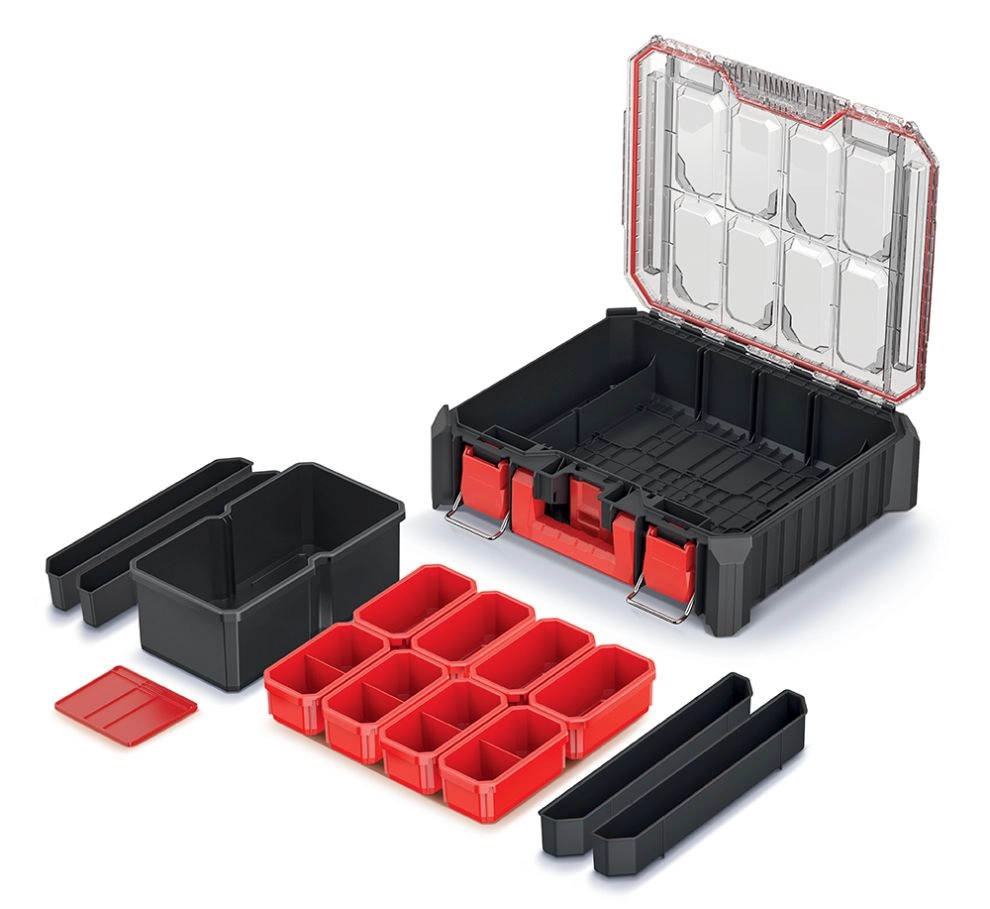 De CMX-organizer is ontworpen voor zowel professionals als doe-het-zelvers die maximale orde en duurzaamheid eisen. De behuizing van een mix van hoogsterke polymeren, aangevuld met ABS-elementen en metalen scharnieren, garandeert een lange levensduur, zelfs bij dagelijks gebruik. Dankzij het transparante polycarbonaatdeksel ziet u de inhoud meteen zonder te openen.