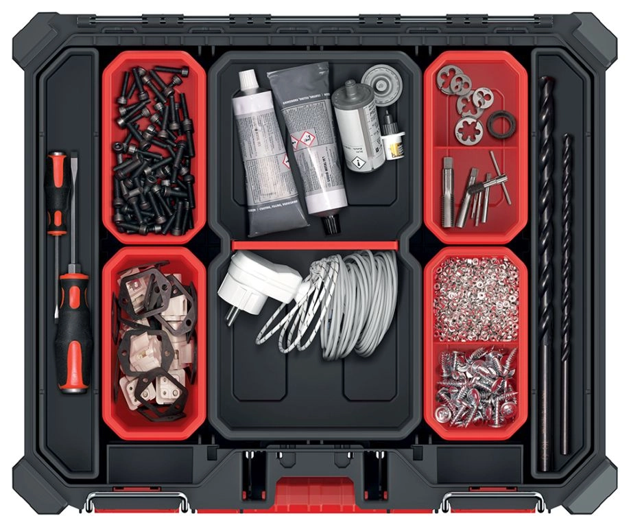 De koffervormige constructie met 13 uitneembare boxen maakt een flexibele indeling mogelijk van klein materiaal, bits, schroeven of pluggen. De stof- en waterbestendige afdichting beschermt de opgeslagen uitrusting zowel op de bouwplaats als in de werkplaats. Het modulaire en stapelbare systeem bespaart ruimte en vergemakkelijkt het transport van meerdere organizers tegelijk.