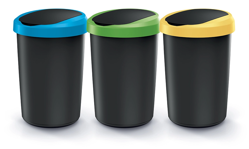 - Overzichtelijke scheiding: deksels in de kleuren blauw (papier), groen (glas), geel (kunststof)