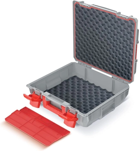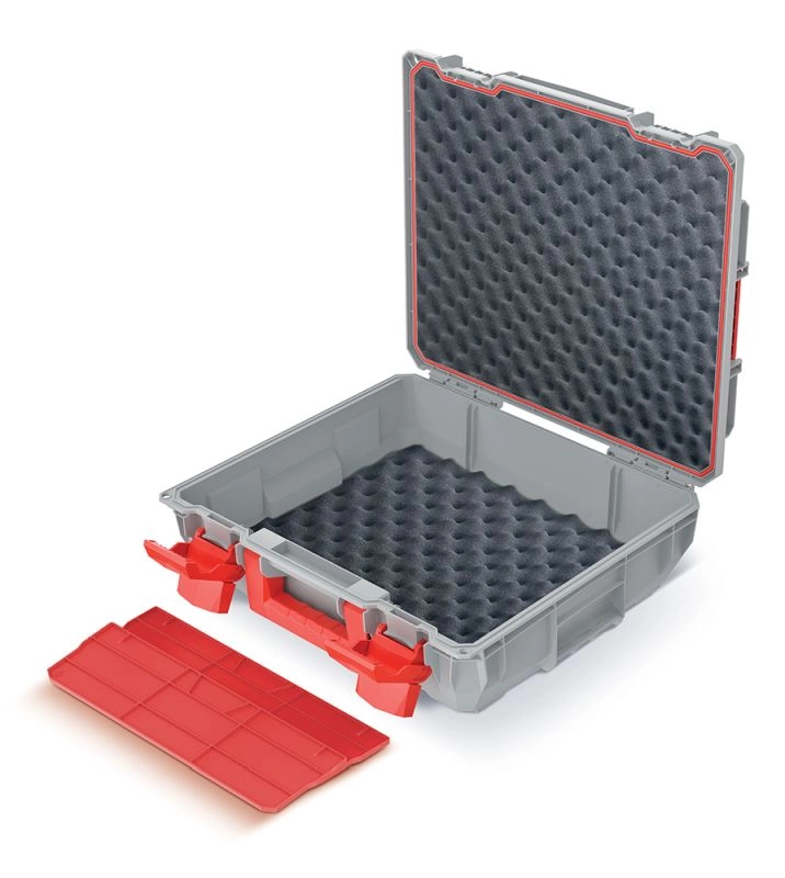 Dankzij de IP55-bescherming is hij bestand tegen stof en spatwater, terwijl ABS-sluitingen het deksel stevig gesloten houden. Twee uitneembare scheidingswanden maken het mogelijk de binnenruimte naar behoefte te configureren en het geïntegreerde handvat vergemakkelijkt de handling, zelfs bij een volle belading tot 25 kg. De compacte afmetingen van 45 × 38 × 13,5 cm passen gemakkelijk in werkplaats, auto of servicewagen.