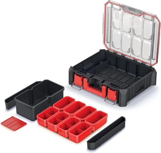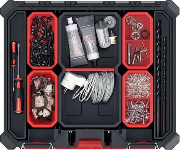 De organizer is ideaal voor vakmensen en doe-het-zelvers die veilige en overzichtelijke opslag van bevestigingsmateriaal en accessoires nodig hebben. Dankzij de afdichting tegen stof en vocht kun je hem zonder zorgen gebruiken in de veeleisendere omgeving van de werkplaats of garage. Het kunststof handvat en de compacte afmetingen maken dragen eenvoudig.