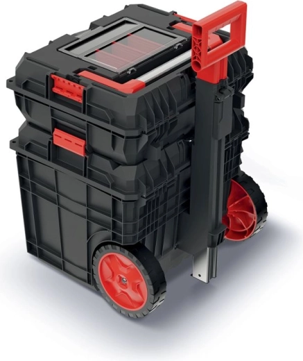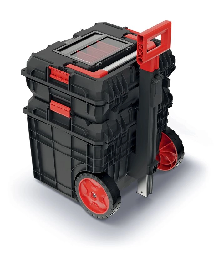 Beide koffers zijn van stevig kunststof in het zwart en hebben een vergrendelingssysteem, compacte afdichting en ABS-sluitingen, die bescherming tegen stof en vocht garanderen, ook tijdens transport. Dankzij de geïntegreerde wielen van de grotere koffer is het verplaatsen van gereedschap snel en comfortabel, zelfs over langere afstanden.