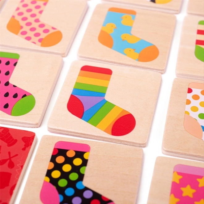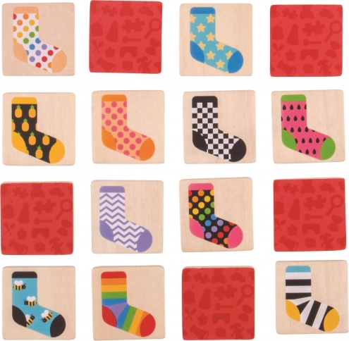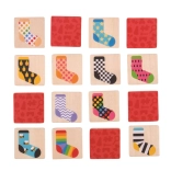 Verhoog het spelplezier met kinderen met de houten memory met sokken. Dit spel stimuleert het geheugen en bevordert concentratie en de ontwikkeling van strategische vaardigheden. Alles wat je nodig hebt is de 32 houten speelstukken met de afbeelding naar beneden leggen en beginnen met het omdraaien van twee stukken tegelijk. De moeilijkheidsgraad neemt geleidelijk toe, de speler probeert paren van sokken te vinden en nieuwe strategieën aan te leren.