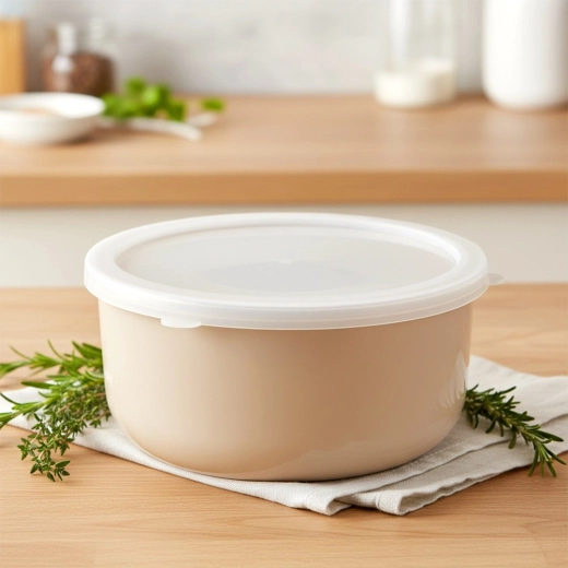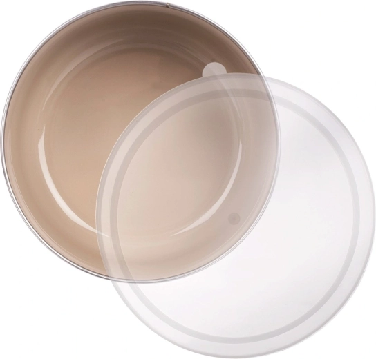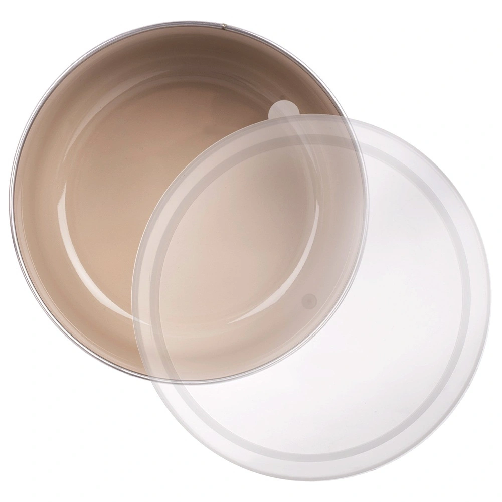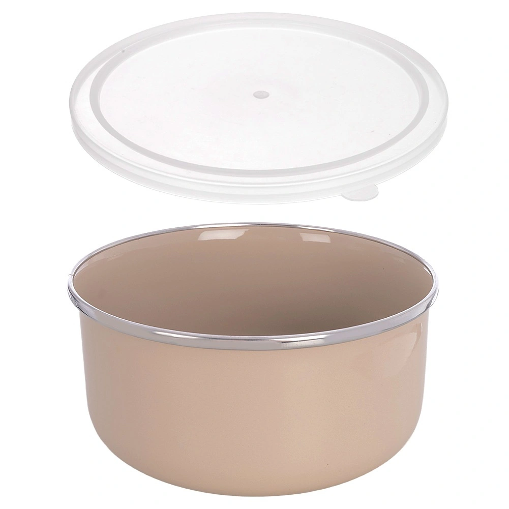 Praktische geëmailleerde kom met deksel van 1,3 l in een stijlvolle beige kleur. Ideaal voor bewaren, serveren en meenemen van gerechten, met de mogelijkheid tot verwarmen op het fornuis en in de oven. Het transparante deksel zorgt voor een dichte afsluiting en zicht op de inhoud, terwijl de roestvrijstalen rand duurzaamheid en een elegante uitstraling biedt.