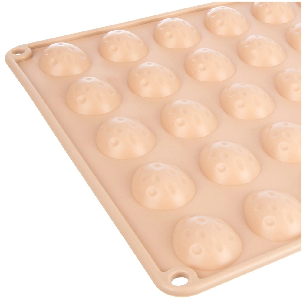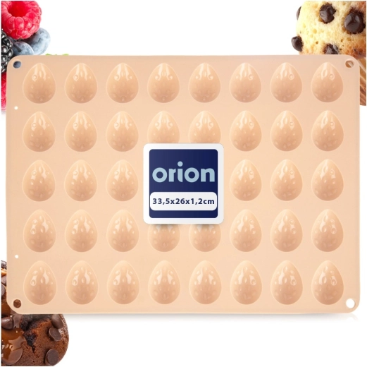De multifunctionele vorm met afmetingen 33,5 × 26 × 1,5 cm biedt plaats aan veertig halve eivormige holtes van ca. 4 × 3 cm – ideaal voor pralines, chocolaatjes en mini-koekjes.