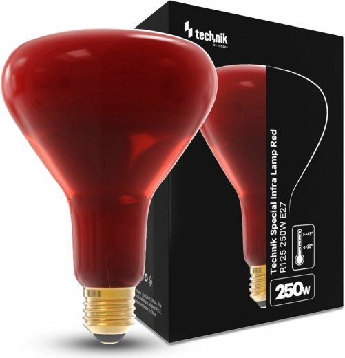Krachtige infraroodlamp Modee Technic met E27-fitting en een vermogen van 250 W, ideaal voor verwarming en speciale toepassingen, niet voor standaard huisverlichting. Biedt dimbare werking, een robuuste glazen behuizing en de klassieke vorm R125 voor gericht stralingswarmte.