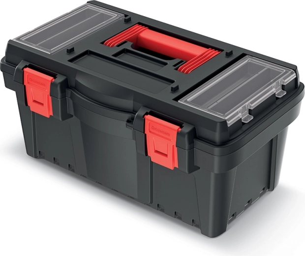 Praktische gereedschapskoffer voor overzichtelijke opslag en eenvoudig vervoer. Biedt compacte afmetingen, laag gewicht en een duurzame constructie van polymeermengsel. Dankzij de ergonomische handgreep van ABS en betrouwbare kunststofsluitingen is hij ideaal voor dagelijks gebruik in de werkplaats en thuis. Interne vakken en bakjes voor kleine onderdelen houden alles op zijn plaats.