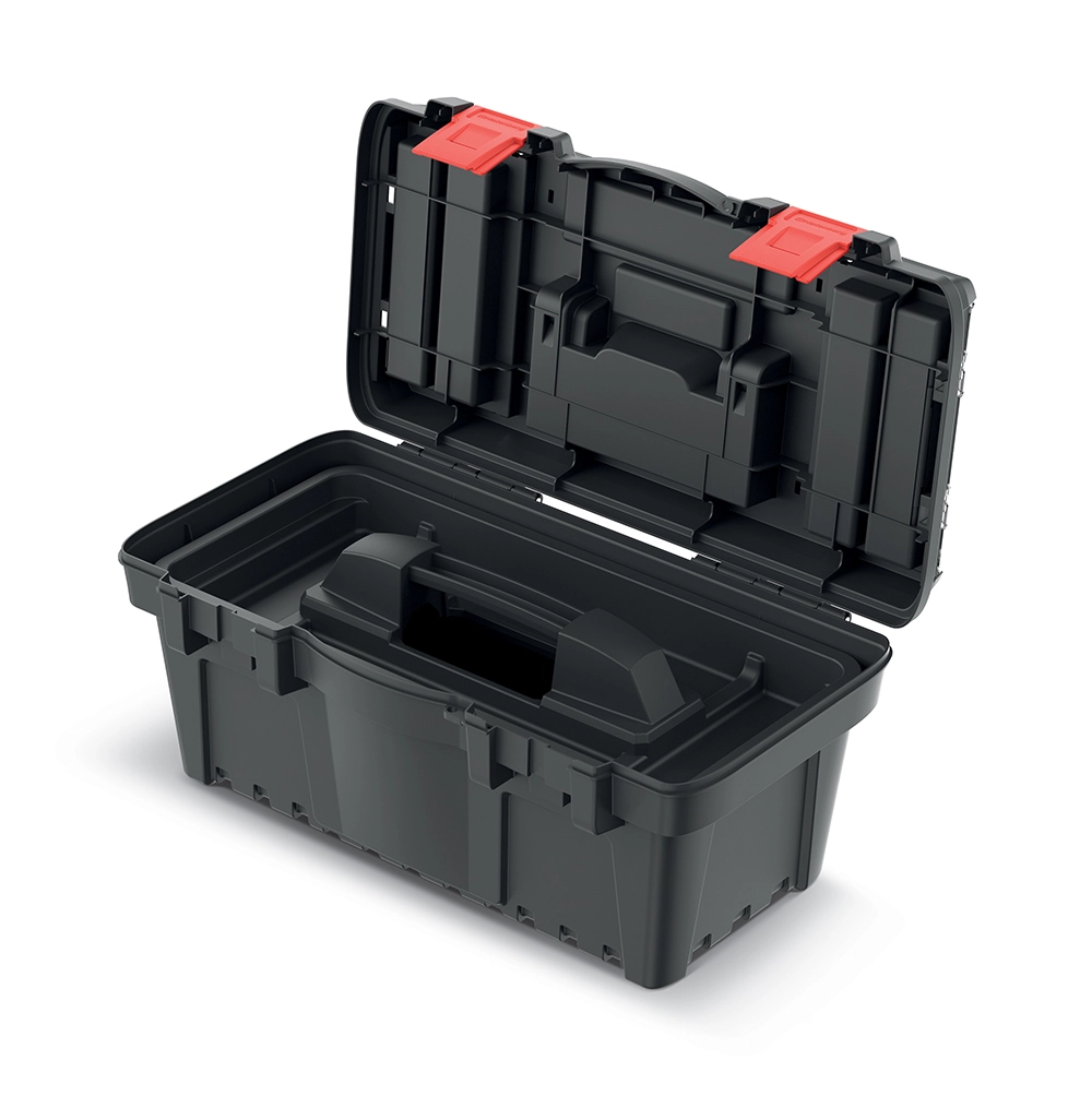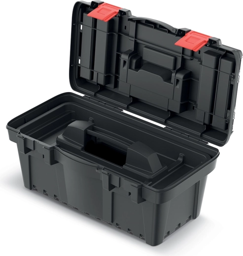 Doordachte details, zoals vakken in het deksel en bakjes voor kleine onderdelen, besparen tijd en ruimte. De ergonomische ABS-handgreep ligt goed in de hand en maakt dragen eenvoudig, terwijl stevige kunststofsluitingen de inhoud veilig houden tijdens hantering en transport.