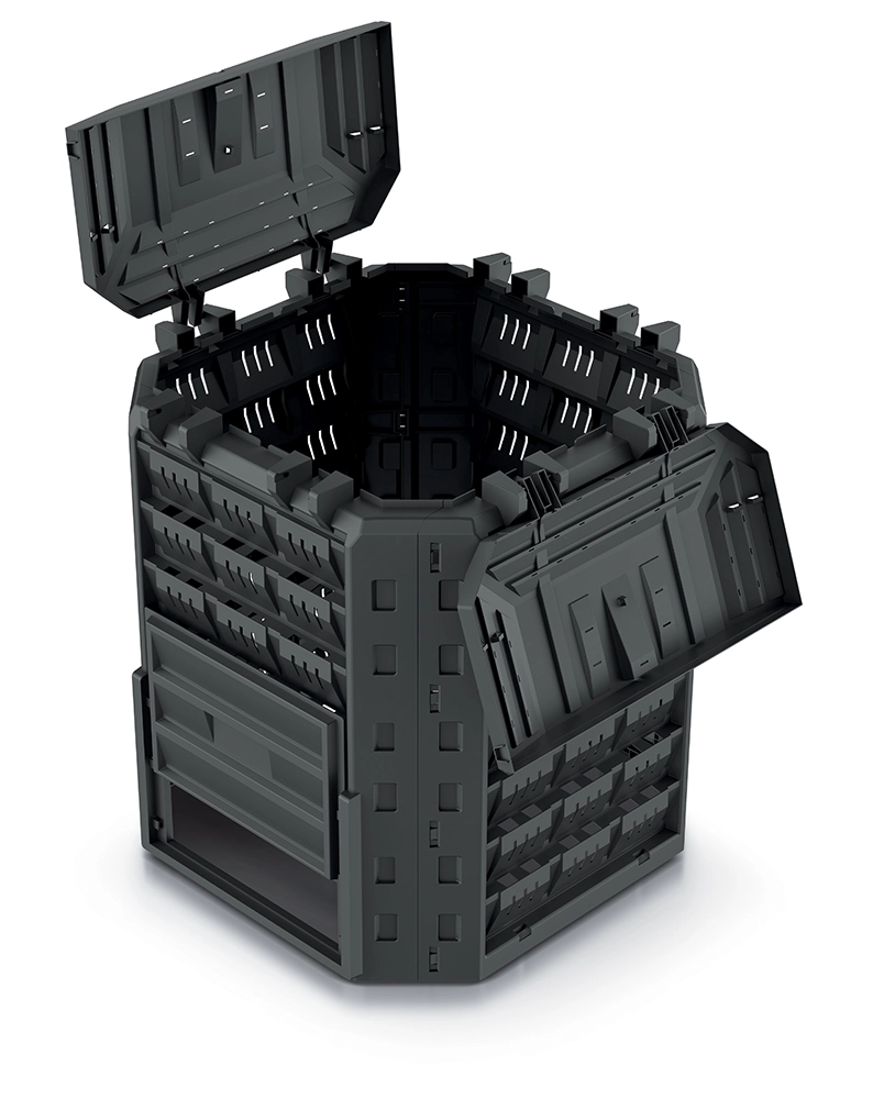 De bovenklep met mogelijkheid tot vergrendeling beschermt de inhoud tegen wind en dieren, terwijl de grote opening het dagelijkse inwerpen van afval vereenvoudigt. Rondom geplaatste ventilatieopeningen zorgen voor een goede luchtcirculatie en behouden de optimale vochtigheid, wat het composteerproces versnelt. De afgewerkte compost neemt u gemakkelijk uit via twee onderste schuifdeurtjes. Vier grondpennen verankeren de composter stevig aan de ondergrond voor extra stabiliteit.