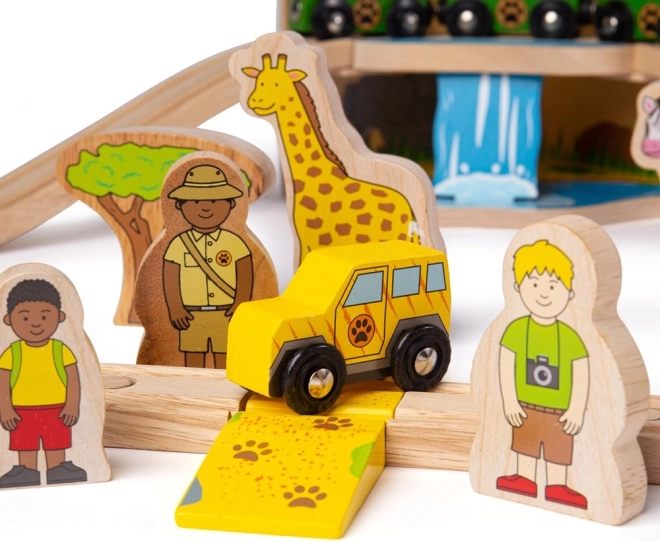 Ontdek de safariwereld met een kleurrijke en stevige houten treinbaan die kinderen vanaf 3 jaar zal bekoren. De set bevat dieren zoals een olifant, zebra en aap, boompjes, bordjes en een brug waarover de gele locomotief met twee wagonnetjes rijdt. Dankzij de magnetische koppelingen is het spel intuïtief en uit te breiden.