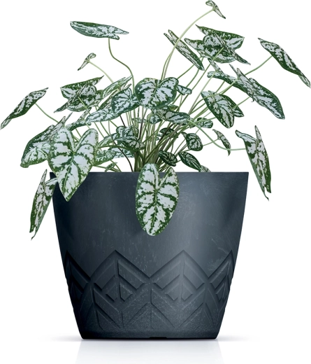 Het subtiele reliëf van driehoeken en pijlen geeft de Areco-bloempot visuele diepte en accentueert elke plant zonder overdadige versiering.