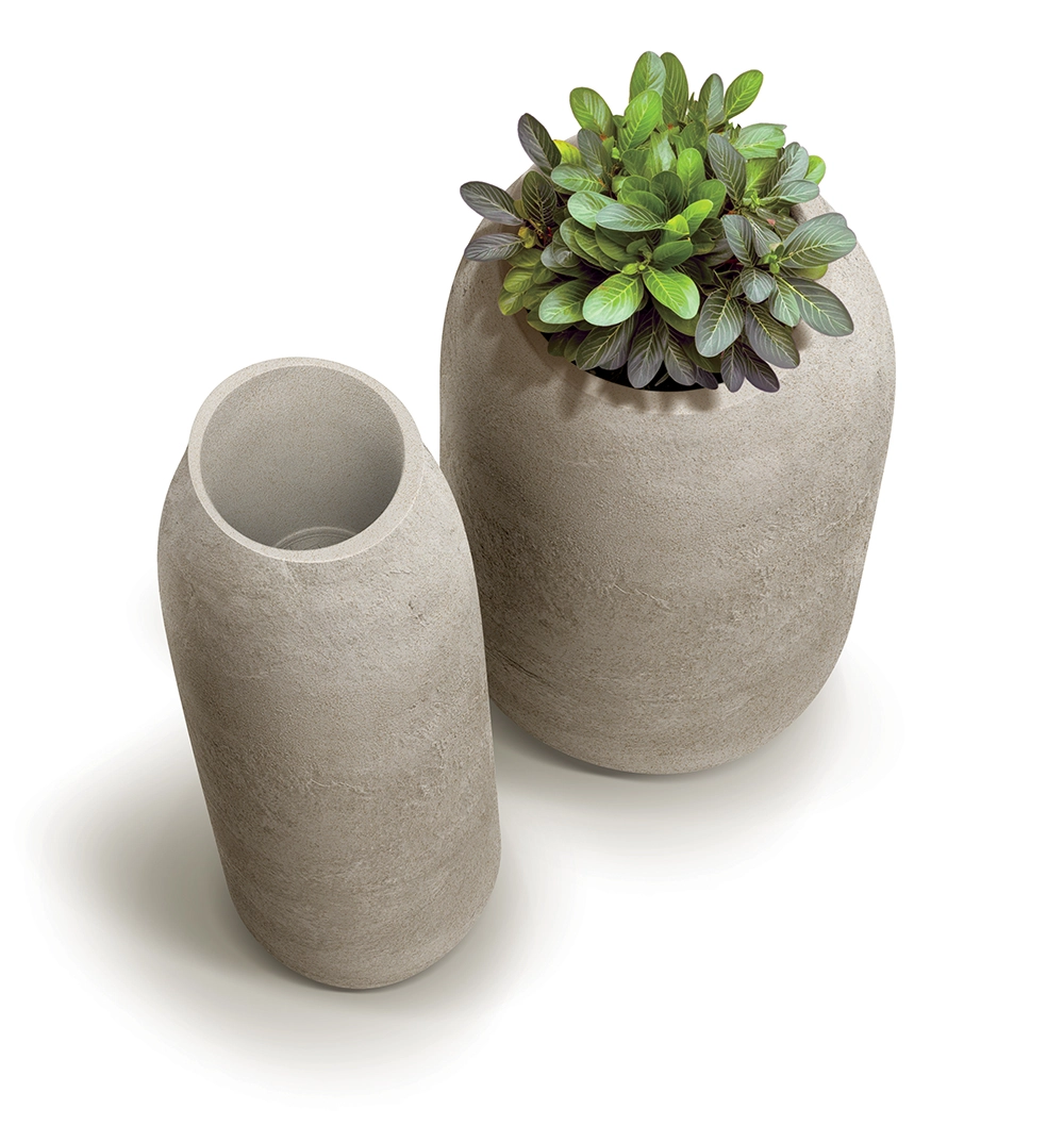 De oppervlaktestructuur imiteert beton natuurgetrouw, terwijl de lichte en stevige kunststof het verplaatsen en plaatsen binnen en buiten vergemakkelijkt.