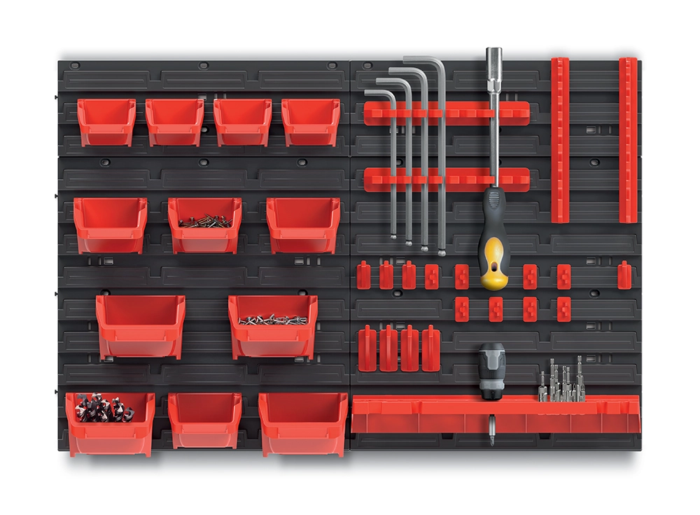 Krijg orde in gereedschap en bevestigingsmateriaal dankzij het hangsysteem dat paneel, bakken, haken en plank tot één functioneel geheel combineert. Duurzaam kunststof in een elegante zwart‑rode combinatie garandeert een lange levensduur en eenvoudig onderhoud, terwijl doordachte accessoires snelle toegang bieden tot alles wat je tijdens het werk nodig hebt.