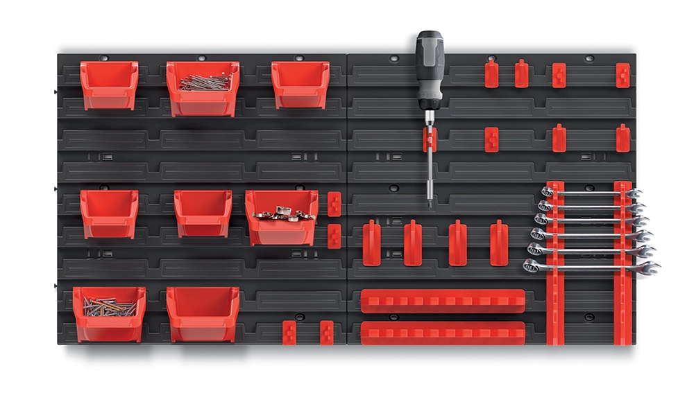 Houd orde en snelle toegang tot gereedschap dankzij het doordachte ophangsysteem. Het paneel biedt een combinatie van opbergbakken voor klein materiaal en haken voor het ophangen van gereedschap, zodat u alles overzichtelijk op één plek heeft. Robuust kunststof weerstaat dagelijks gebruik en de zwart‑rode uitvoering geeft uw werkplaats een professionele look.