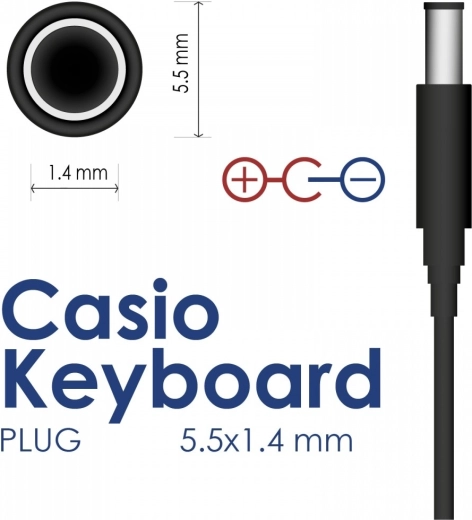 Betrouwbare voedingsadapter voor CASIO-toetsenborden met uitgang van 9 V en 1 A voor stabiele prestaties en veilig gebruik. Dankzij de standaardconnector 5,5 × 1,4 mm is hij ideaal als vervanging van de originele voeding. Biedt een lange kabel van 1,5 m, een compact ontwerp en beveiliging tegen overspanning, oververhitting en kortsluiting – de perfecte keuze voor thuis oefenen, studio en podium.