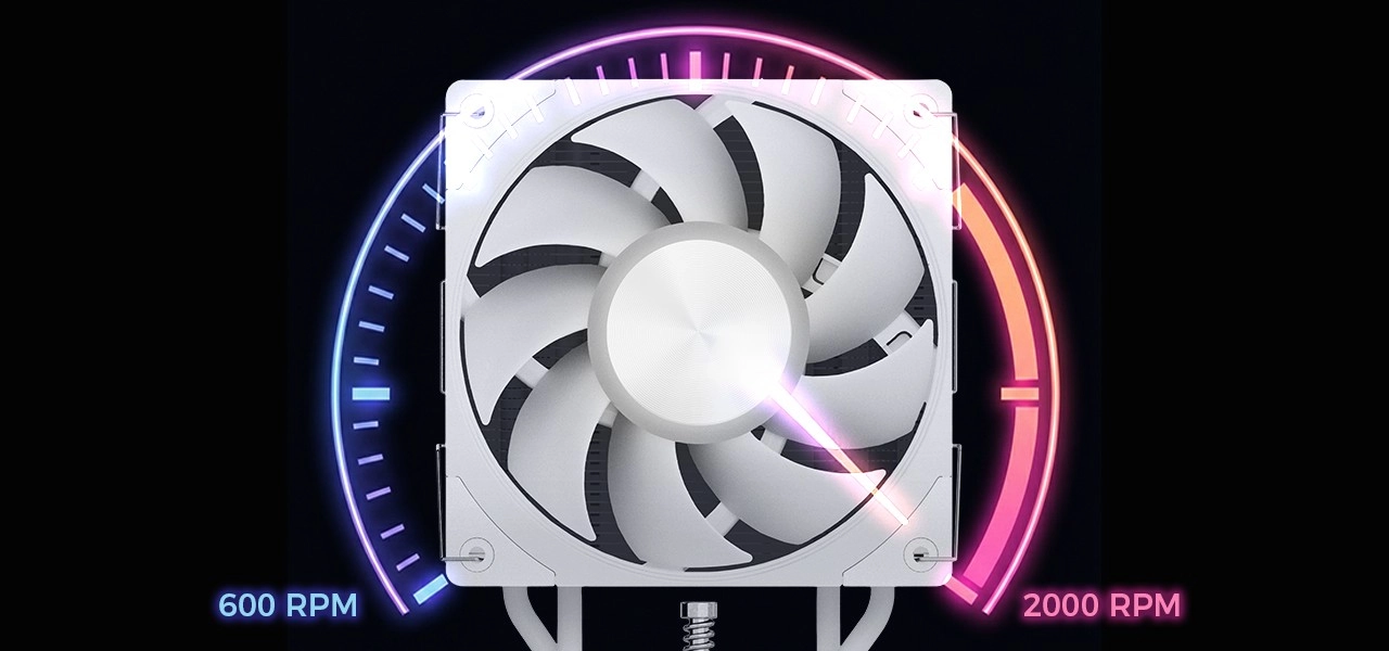 Vier koperen heatpipes transporteren warmte van de perfect gepolijste basis naar dichte aluminium lamellen, waar deze wordt afgevoerd door de 120 mm PWM-ventilator met een bereik van 600–2000 rpm. Het resultaat is een hoge luchtstroom van 75 CFM en een laag geluidsniveau rond 28 dBA – ideaal voor nachtelijk gamen en stille werkomgevingen. De hoogte van slechts 153 mm maakt montage in de meeste ATX-behuizingen eenvoudig.