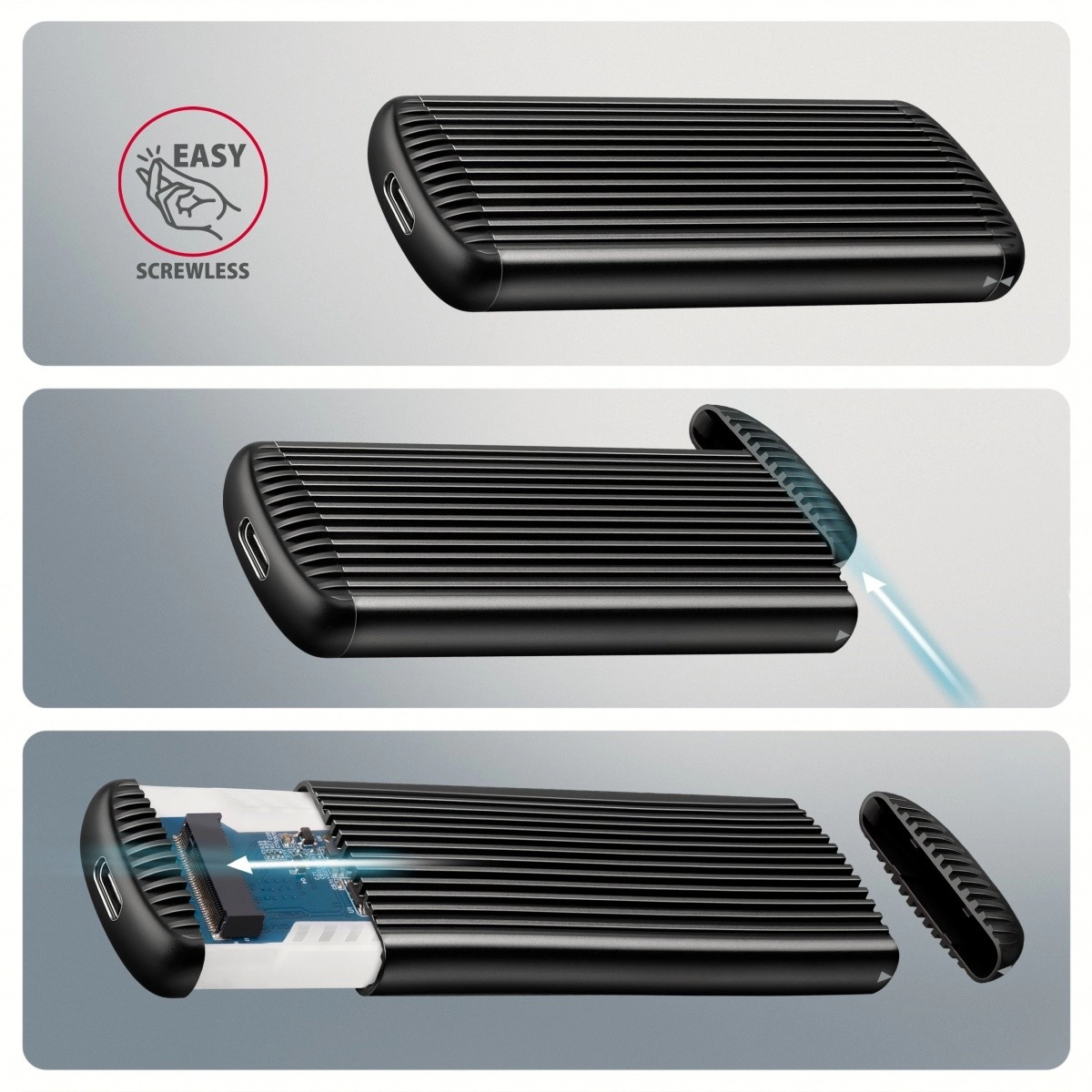 De schroefloze constructie versnelt de installatie en vervanging van SSD’s aanzienlijk bij klonen, datamigratie of capaciteitsuitbreiding. De geribbelde aluminium behuizing met thermisch geleidende pad voert warmte effectief af, voorkomt thermal throttling en behoudt stabiele prestaties. De behuizing ondersteunt zonder capaciteitsbeperking enkel- en dubbelzijdige NVMe-modules met lengtes van 30–80 mm.