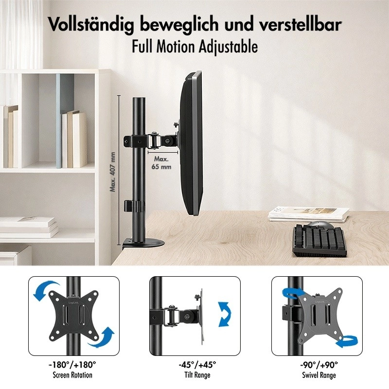 - Volledige flexibiliteit: rotatie 180°, kanteling -45° tot +45°, pivot -90° tot +90°.
