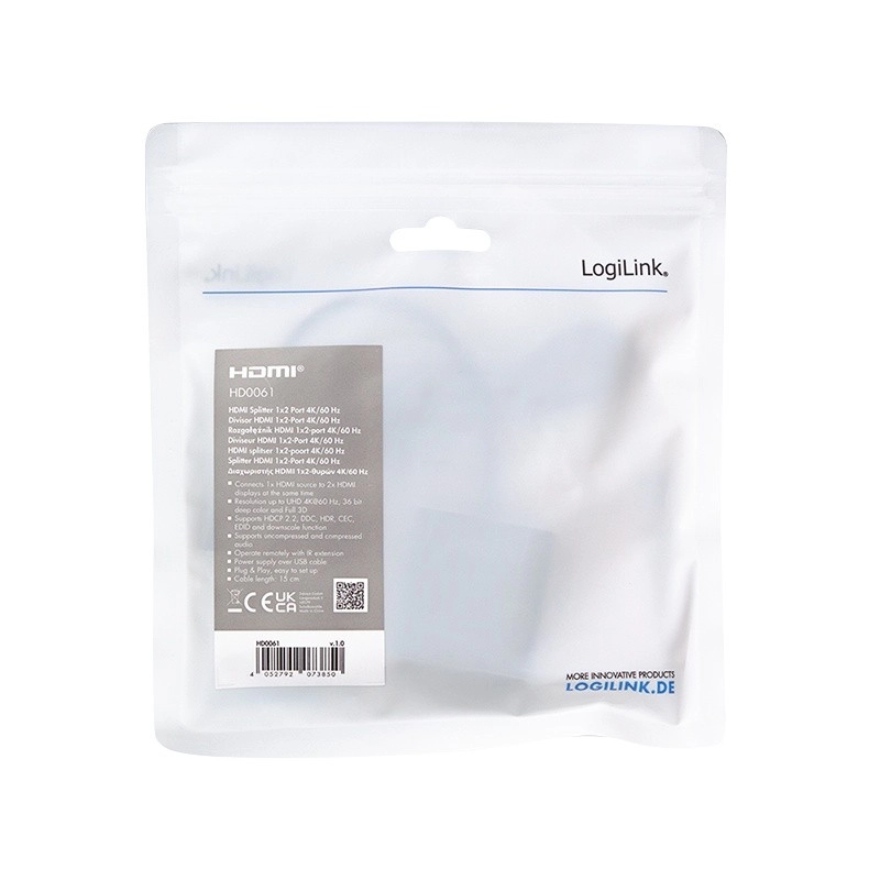 De HDMI-splitter van LogiLink splitst het signaal van één bron naar twee beeldschermen in 4K UHD bij 60 Hz. Nooit meer kabels wisselen – ideaal voor presentaties, showrooms, winkels, restaurants en home cinema. Dankzij de ondersteuning voor een IR-interface kunt u de splitter en de tv bedienen met een afstandsbediening (optioneel).