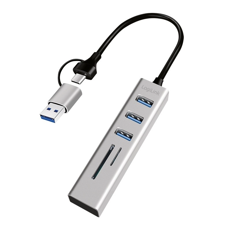 Breid in een handomdraai de aansluitingen van je laptop, telefoon of tablet uit: deze compacte LogiLink-hub biedt 3× USB 3.0 voor snelle overdrachten, een ingebouwde SD- en microSD-kaartlezer en een praktische 2-in-1-kabel met USB‑C- en USB‑A-adapter. Ideaal voor onderweg, met een aluminiumlook en plug & play zonder installatie.