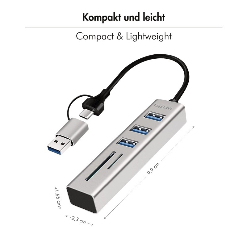 De elegante en lichte LogiLink-hub verandert direct één poort in drie snelle USB 3.0 poorten en twee kaartlezers. Geen drivers nodig: gewoon aansluiten en meteen foto’s, video’s en documenten kopiëren. Dankzij de 2-in-1-connectiviteit (USB‑C/USB‑A) is hij compatibel met moderne laptops én oudere computers en randapparatuur.
